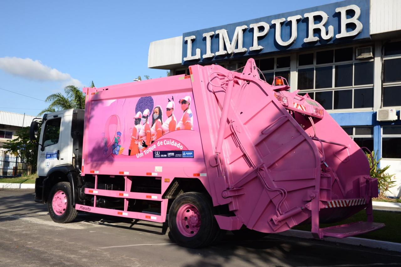 Os caminhões plotados e os uniformes padronizados fazem parte das atividades desenvolvidas pela Prefeitura em alusão ao Outubro Rosa. A iniciativa marca o Mês Internacional de Combate ao Câncer de Mama e, em especial ao Dia Mundial de Combate do Câncer de Mama, celebrado nesta quinta-feira (19).