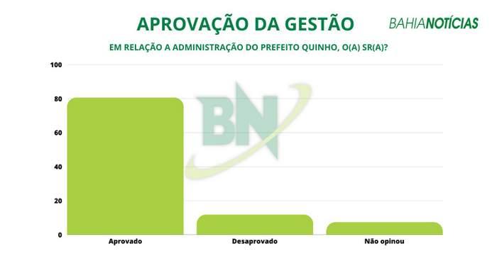 Ainda com relação à Gestão Municipal, Quinho foi desaprovado por apenas 11,87% dos eleitores e 7,47% não souberam ou não opinaram. A pesquisa ouviu 750 eleitores entre os dias 29 de abril e 1º de maio e tem margem de erro de 3,5% para mais ou para menos e 95% de intervalo de confiança. O levantamento está registrado no Tribunal Superior Eleitoral (TSE) sob N° BA-07711/2024.