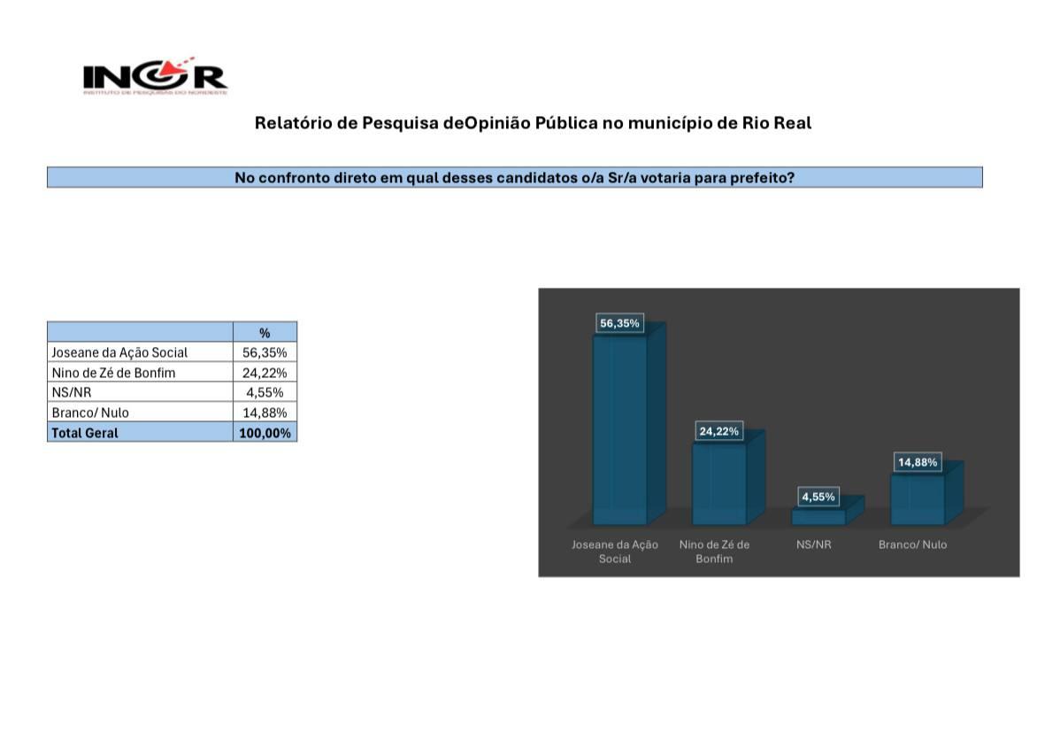 Acaba de ser divulgado o descritivo com resultados da Pesquisa de Opinião Pública, registrada no TSE sobe o nº BA- 07087/2024, planejada e executada pelo Instituto de Pesquisa do Nordeste (INOR), CONRE 5ª Região n° 8693, CNPJ:47.525.411/0001-64 no município de Rio Real, estado daBahia, com trabalho de campo realizado no dia 11 de junho de 2024, com 417 entrevistas presenciais, pessoais e indivíduos com“margem de erros” de 4,76%, Estatístico responsável Drielly Rodrigues CONRE 5ª Região n° 10591, empresa contratada Priscila de Brito Carvalho Baptista De Rio Real ME.