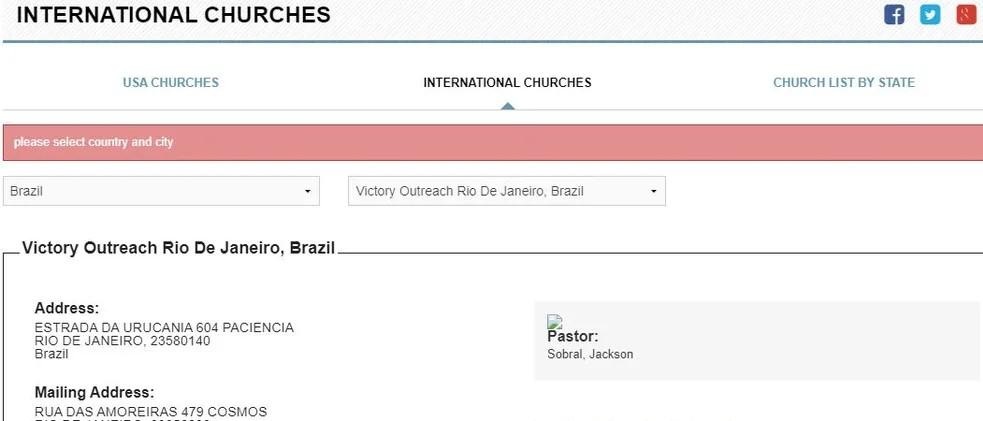 Site da igreja internacional Victory Outreach mostra endereço de sítio e nome do pastor Jackson Sobral — Foto: Reprodução