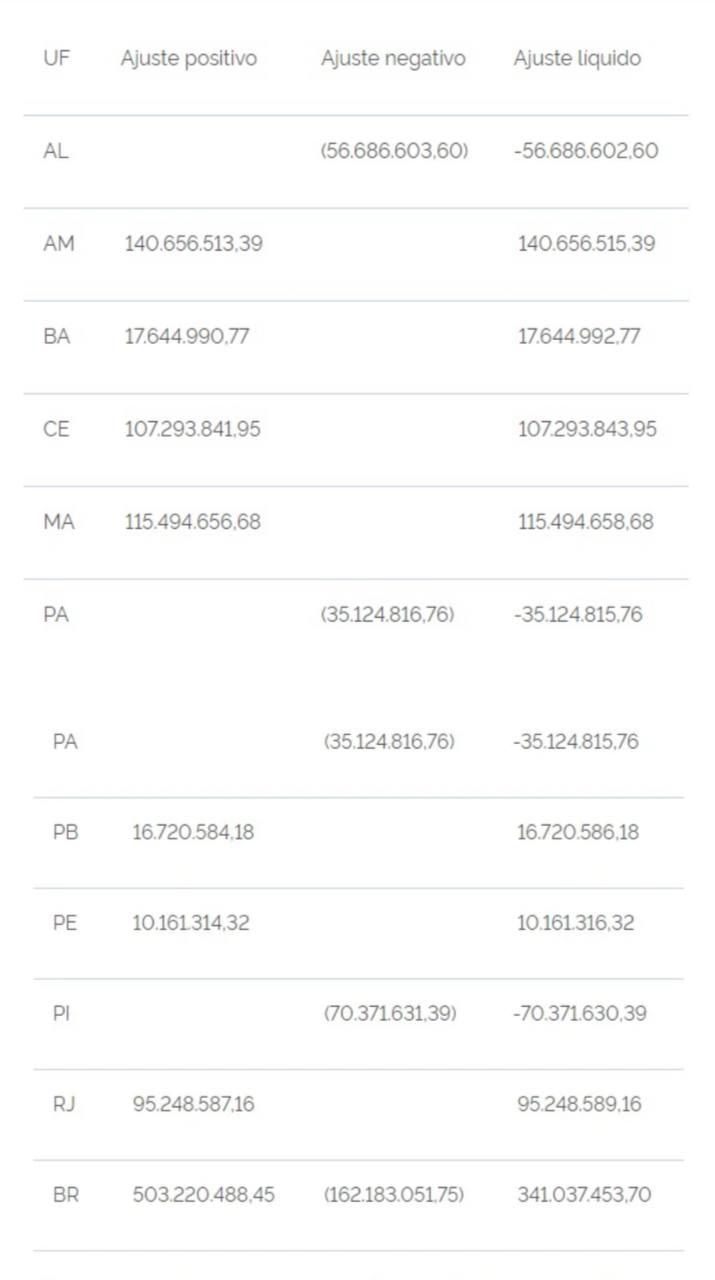 Quanto à adequação da distribuição da complementação da União na modalidade Vaaf, o impacto entre os estados que recebem o recurso se encontra resumido na tabela abaixo: