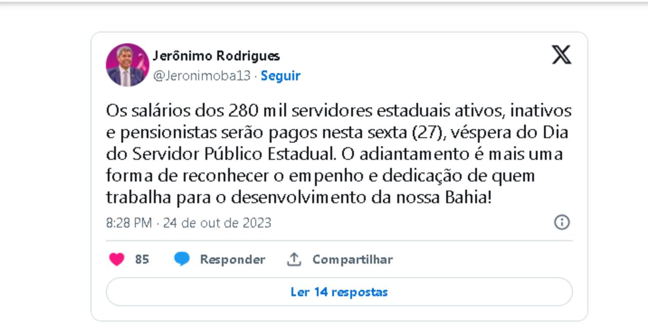 O governador Jerônimo Rodrigues (PT) anunciou, na noite desta terça-feira (24), através das redes sociais, que vai antecipar o salário dos 280 mil servidores ativos, inativos e pensionistas referente ao mês de outubro, em função do dia do Dia do Servidor Público Estadual, comemorado no próximo sábado (28). O pagamento, originalmente programado para o último dia útil do mês, será realizado nesta sexta-feira (27), em lote único.