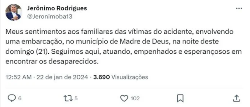Ainda na madrugada desta segunda-feira (22), o governador Jerônimo Rodrigues se manifestou nas redes sociais sobre o naufrágio de uma embarcação que fazia travessia entre a ilha de Maria Guarda e Madre de Deus, ocorrido na noite deste último domingo (21).