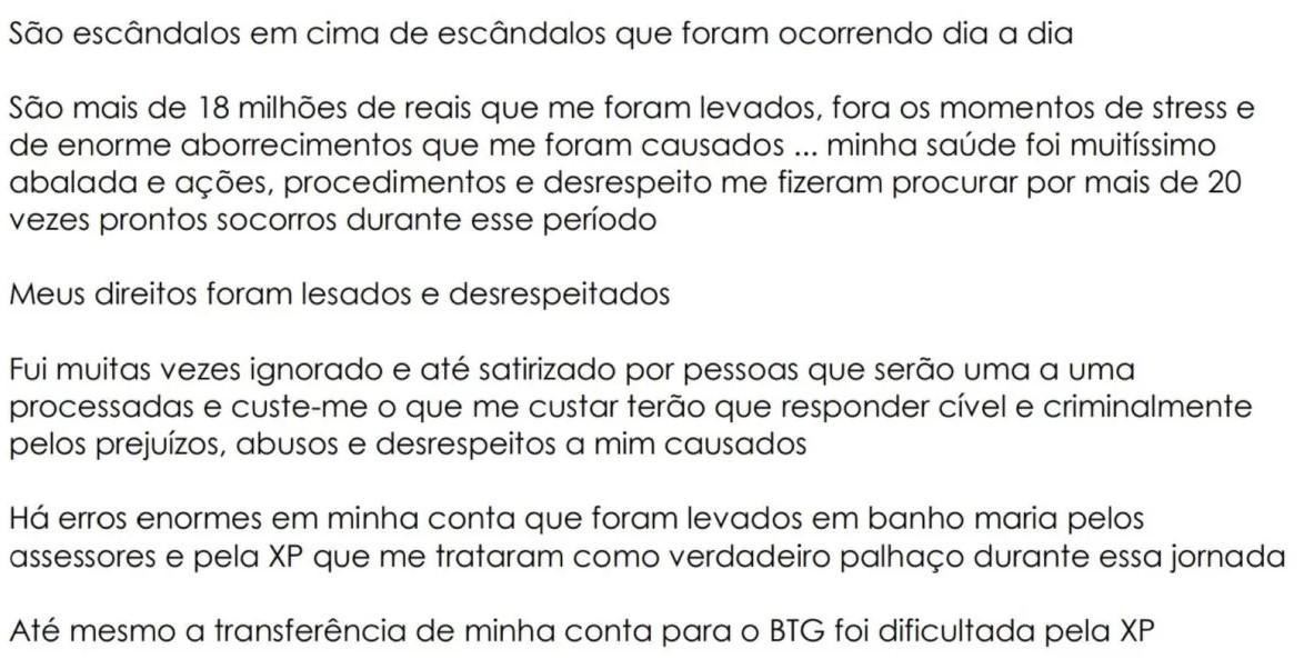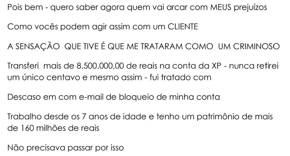 “Não bastasse a XP ter me tirado mais de R$ 18.000.000,00 com cobranças totalmente absurdas e incorretas, eu ainda fui pisoteado pela XP e por seus assessores de investimento, que ignoraram minhas reclamações e não deram ouvidos a nenhuma de minhas afirmações”, disse o empresário, em outro e-mail, desta vez, com cópia para o fundador da XP, o economista Guilherme Benchimol.