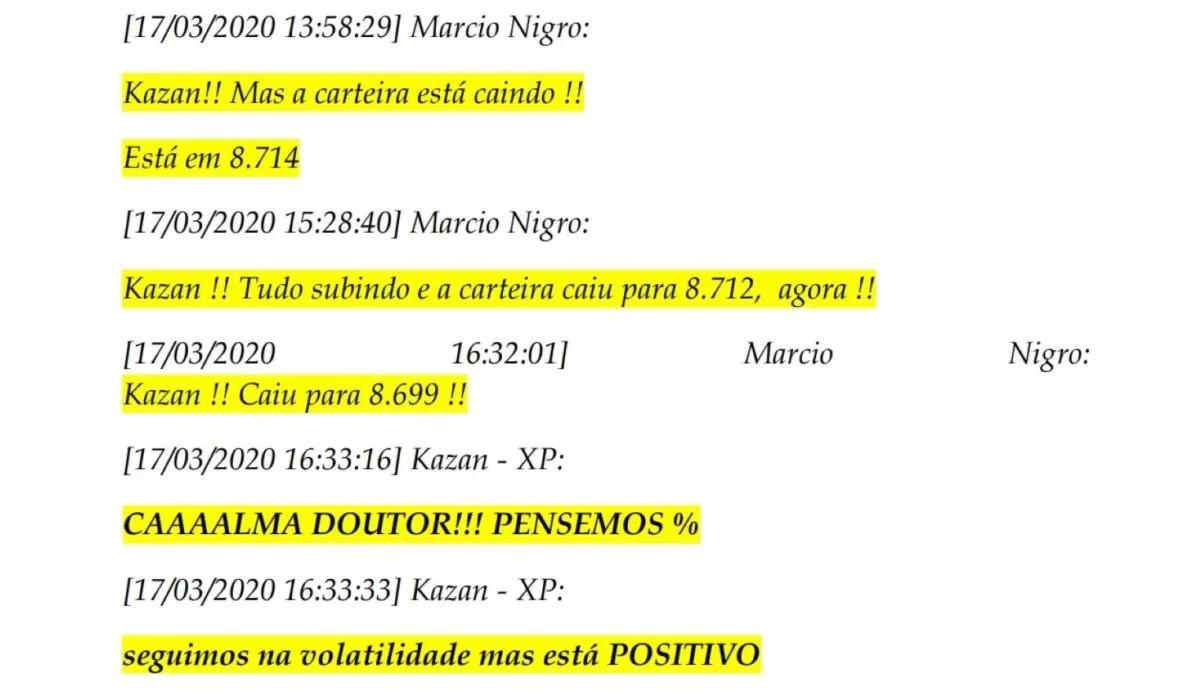 Mensagens anexadas ao processo mostram, em meio à queda livre das ações com alavancagem, o assessor dizendo que havia conseguido “blindar” o patrimônio de Nigro das oscilações de mercado. “Caaaalma, doutor!!! Pensemos %. Seguimos na volatilidade, mas está positivo”, disse o assessor ao cliente, em uma das mensagens. Somente após perceber que a perda havia atingido um patamar milionário, o assessor sugeriu pôr o dinheiro em uma renda fixa para tentar recuperá-lo aos poucos.