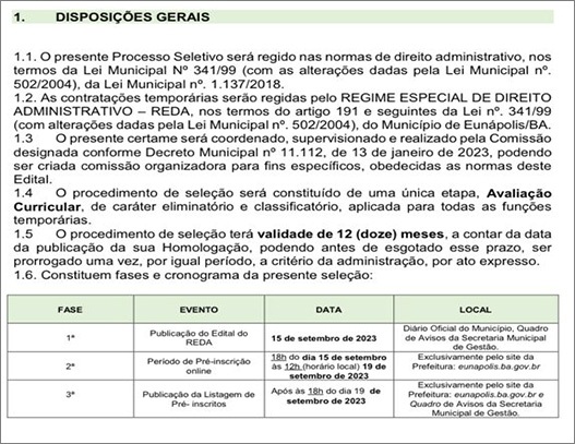 A Prefeitura de Eunápolis abriu, na sexta-feira, 12, por meio de publicação no Diário Oficial do Município, Edital número 006/2023, de chamada pública para Contratação Temporária de Pessoal pelo Regime Especial de Direito Administrativo (REDA), com o objetivo de preencher 96 vagas no Hospital Regional de Eunápolis, após a saída da empresa APAS, prevista para o dia 10 de outubro.