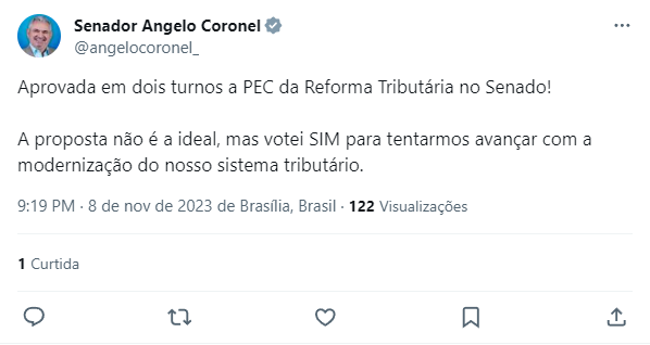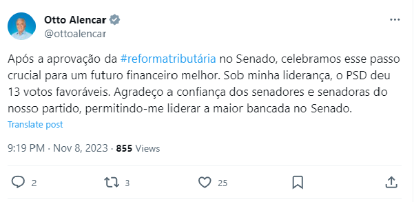 De acordo com Otto, a aprovação da PEC é "um passo significativo para uma mudança positiva em nosso sistema fiscal". "Após a aprovação da #reformatributária no Senado, celebramos esse passo crucial para um futuro financeiro melhor. Sob minha liderança, o PSD deu 13 votos favoráveis. Agradeço a confiança dos senadores e senadoras do nosso partido, permitindo-me liderar a maior bancada no Senado", afirmou.