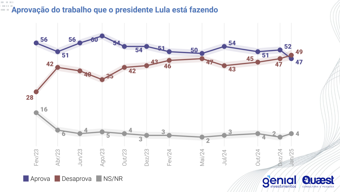 Em relação à pesquisa divulgada em dezembro de 2024, a aprovação do trabalho do presidente caiu 5 pontos, de 52% para 47%, enquanto a reprovação, que era de 47%, agora é de 49%.
