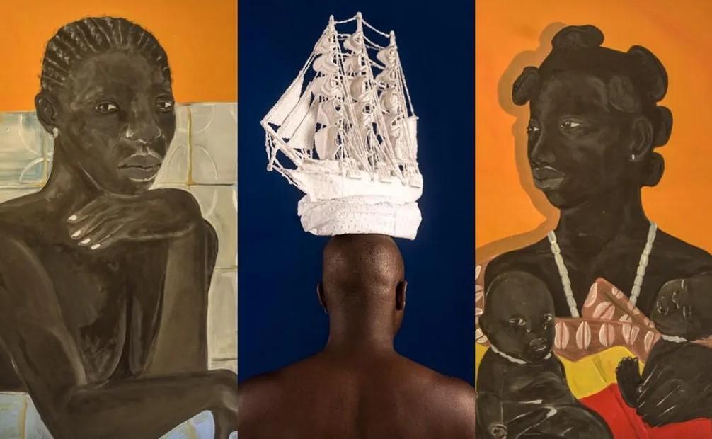 👉🏾 O primeiro ambiente da exposição captura os processos cíclicos de vida e de morte pela ótica da cosmogonia: Kehinde tem a trajetória marcada pela perda dos laços familiares a partir do assassinato da mãe, dos avós e dos irmãos na África pré-colonização, sendo forçada ao tráfico transatlântico.